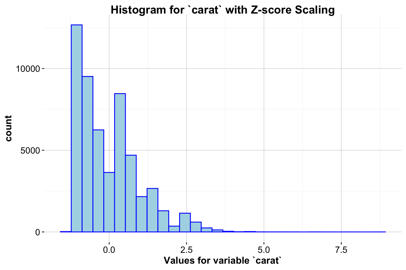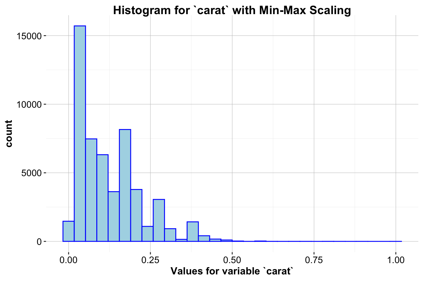 age,capital.gain,capital.loss,hours.per.week). Use themutate()function to apply this transformation.Perform Z-score normalization on the same set of numerical variables. Compare the results with Min-Max scaling. In what scenarios would one approach be preferable over the other?