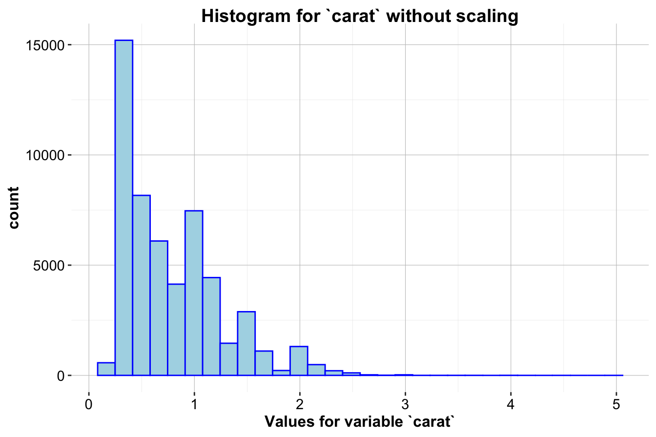carat,price,x,y,z, anddepthare continuous. - Discrete Variables: These variables take countable values, often integers. For example, a count of customers or the number of purchases would be discrete, though this dataset doesn’t include such a variable.