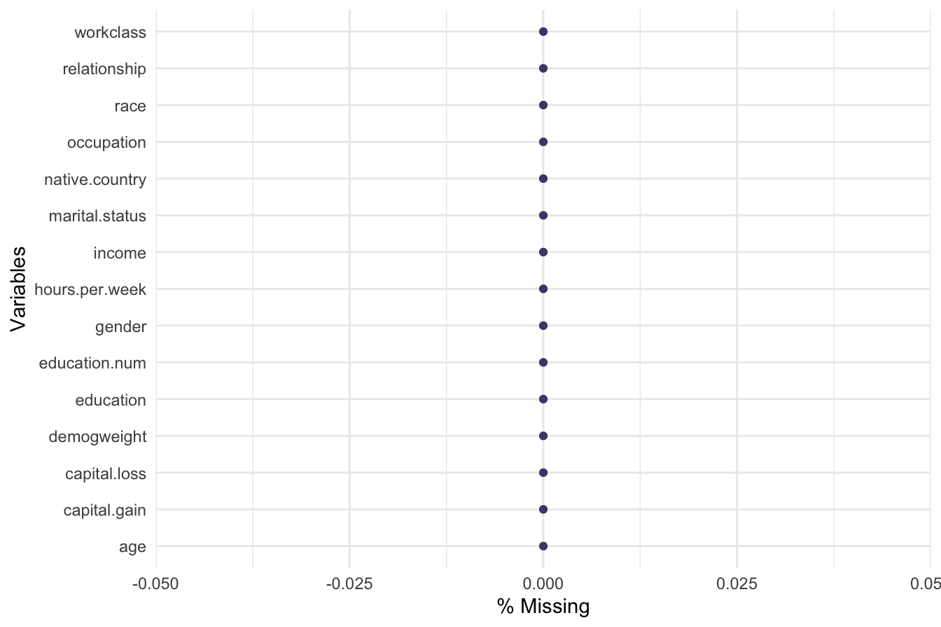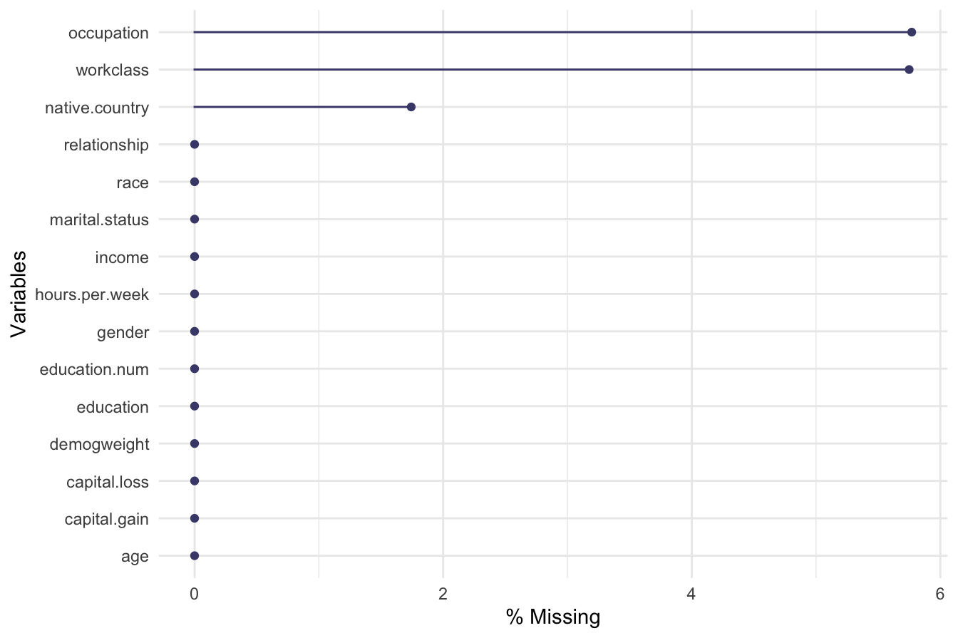 adult$workclass = fct_collapse(adult$workclass, "Unemployed" = c("Never-worked", "Without-pay"))To verify the updated categories, we check the frequency distribution: