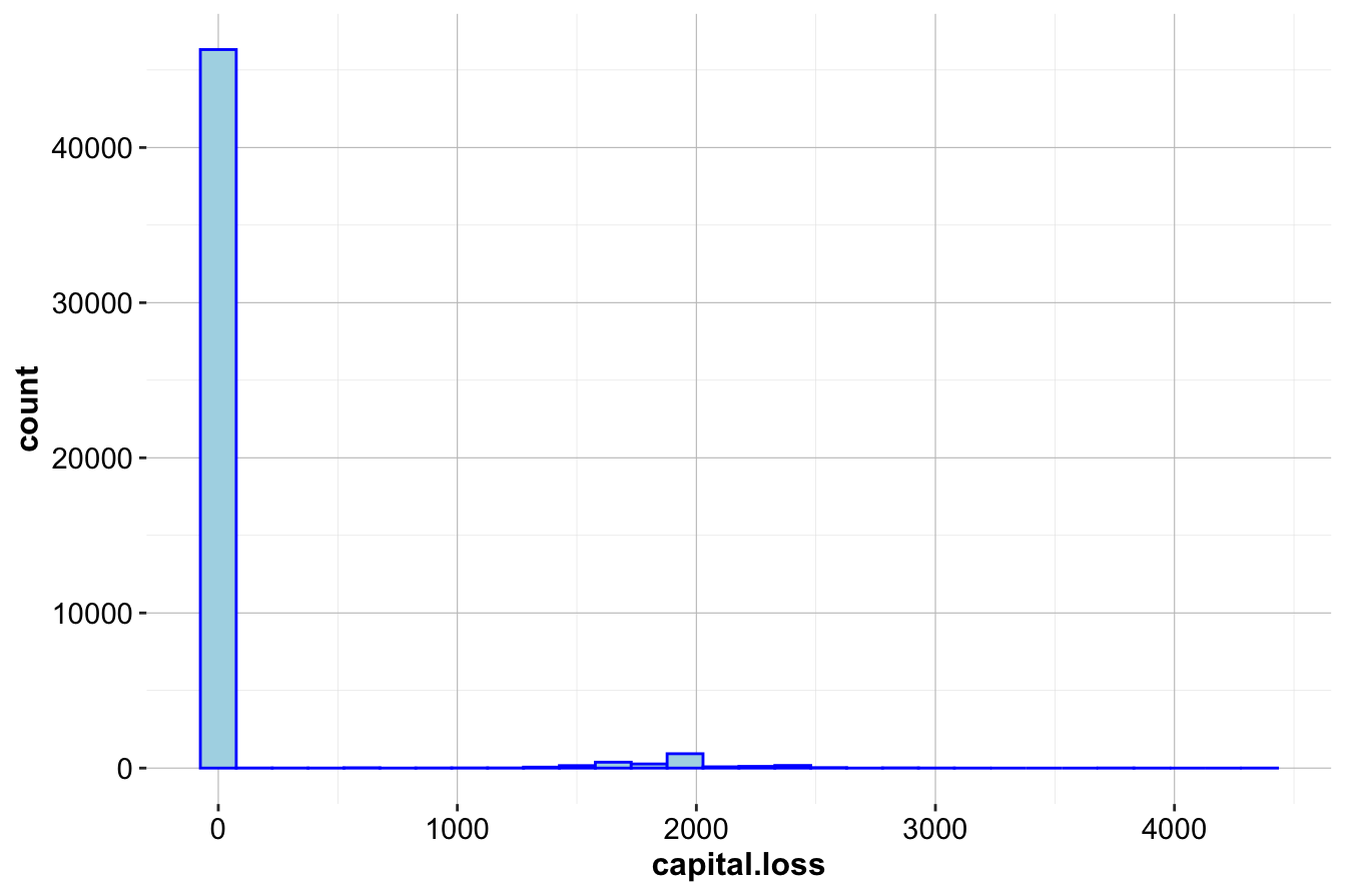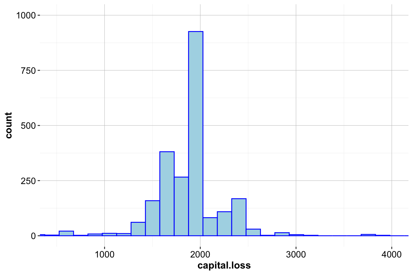 - The histogram indicates that most observations have zero capital loss, with a few cases around 2,000 and 4,000.