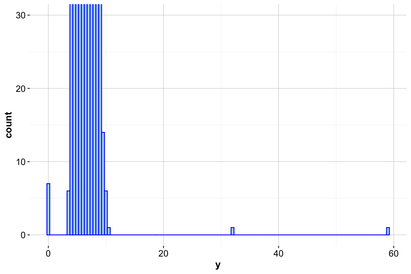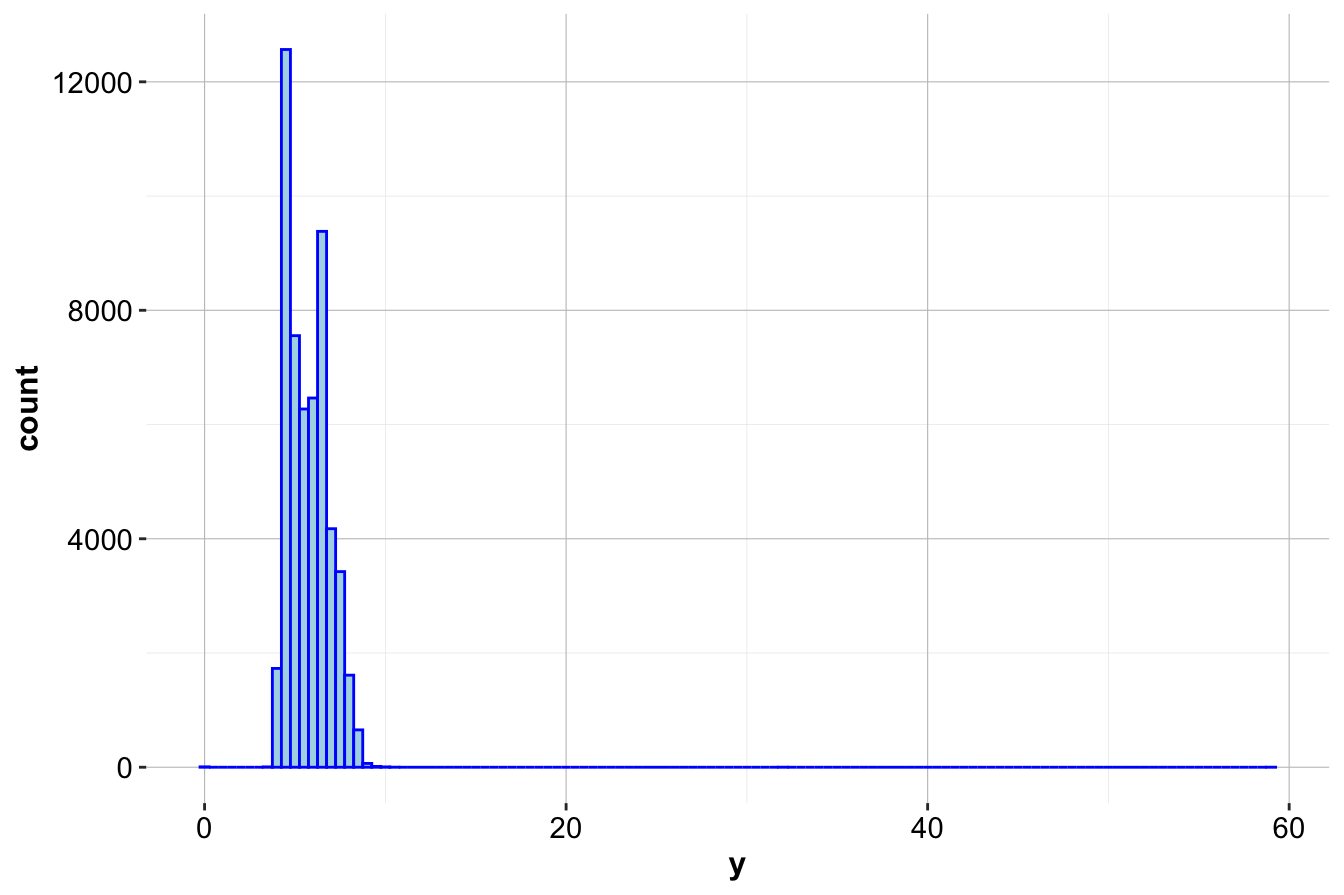 geom_histogram(aes(x = y), binwidth = 0.5, color = 'blue', fill = "lightblue")